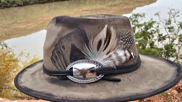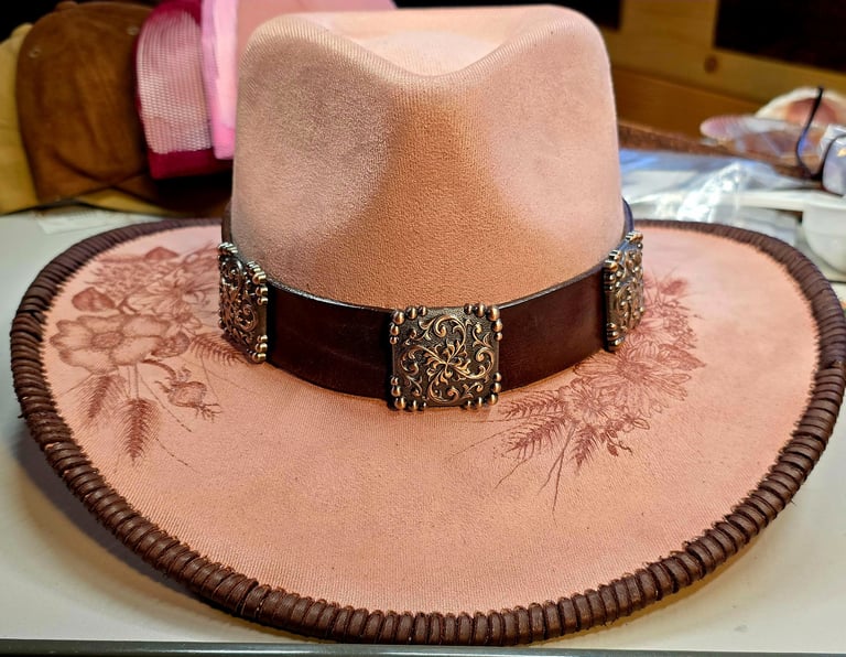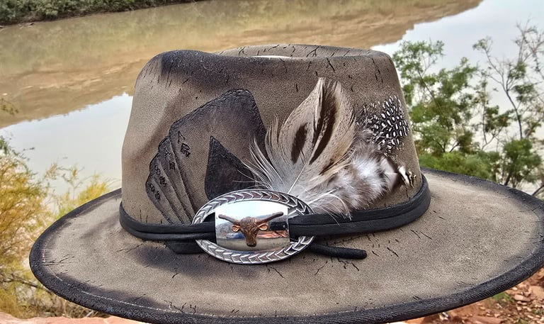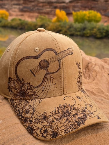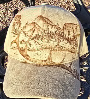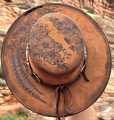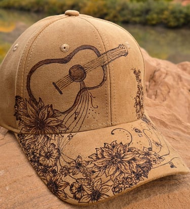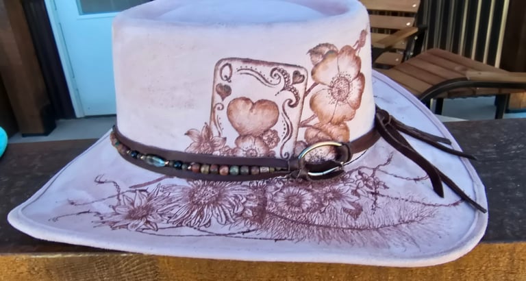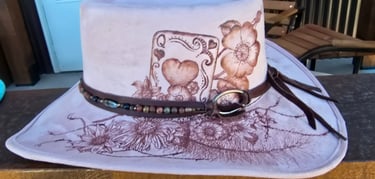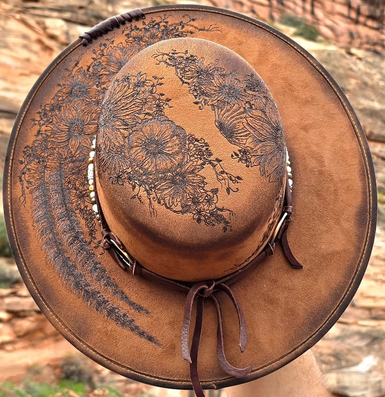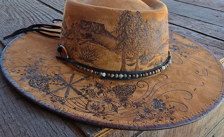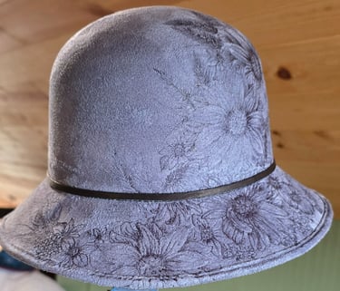 I welcome custom orders and love to collaborate with customers. If you're thinking about a custom hat for yourself or as a gift, ask me about my "storyboard hats" pyrographed specifically with the wearer in mind.